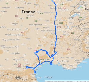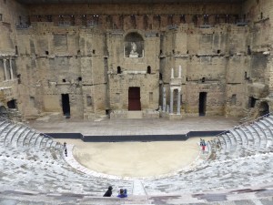 “Merd il pleut”, were the first thoughts this morning, with the sound of the rain beating on Regs head. On the positive side we have a 4 hour drive through the gorges of the Cevannes national park, and where there are gorges, there are rivers and when there’s rain and rivers there are waterfalls, it will be beautiful we said as we headed off. Our destination today is Orange, barely 50 kilometres from pont de Gard, where we were on day 5, but we were more concerned with our artificial schedule then to detour. We have done almost a full circle in this region and believe we now recognise people as old friends.