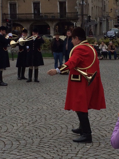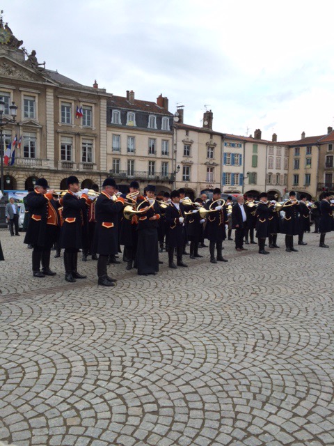 It turned out it was just a “clearing up” shower, so after an hour we were able to walk over the bridge to the town of Pont a Mousson. The town cannot be described as attractive and has a history of steel production, however it did play a key role in the battle of Nancy in WW2, during which the bridge was destroyed. Like most French towns, it has “character” and in this case the character was an hour long concert of “le trompe de chasse ” (a concert of the hunting horn) in the town square, outside the Hotel de Ville, regaled in national flags. The orchestra even wore thir traditional costume.