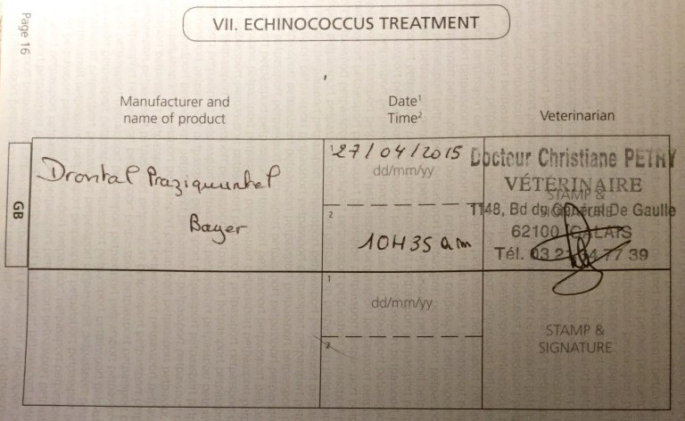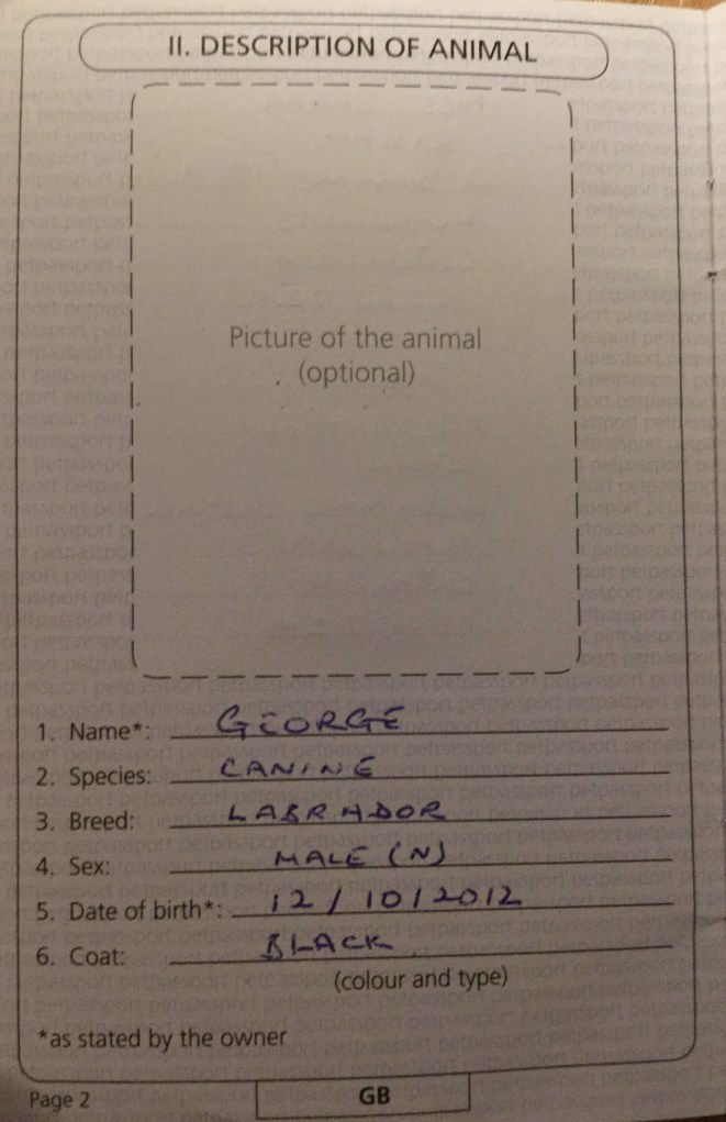 At 10:30 this morning we had found Dr Petry who immediately asked whether George would eat the “bribe” of food that she had before administering the tablet, before we had said ” oui” he had stolen the piece of food she was waving about and had his nose in the can of dog food looking for more!.  She didn’t ask us if he had kept his appetite whilst travelling !.  By 10:35 it was announced that George was now stowaway free and was fit to travel.  First objective achieved.