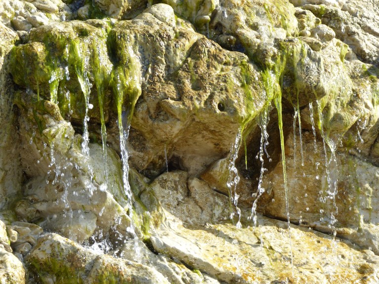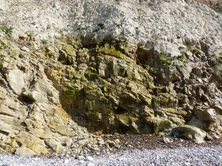 What was interesting about the cliffs (well I thought it was, you have to make up your own mind) was that the different geological layers could be seen, a metre or so of topsoil, followed by the chalk layer and ending at the base in a much harder layer.  The result of this was that water draining through the multiple layers, emerged when it reached the harder layer of stone and formed a waterfall, halfway down the cliff.